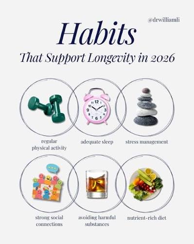 Living a long and healthy life is not about extreme diets, expensive supplements, or complicated routines. Research consistently shows that small daily habits, when practiced consistently, can dramatically improve both lifespan and quality of life.In this article, we’ll explore scientifically supported daily habits that help you live longer, boost energy levels, and protect your body and mind over the long term.1. Start Your Day With Purpose, Not StressHow you begin your morning sets the tone for the entire day. People who rush, check their phones immediately, or start the day stressed tend to experience higher cortisol levels.Healthy morning habits include:Waking up at a consistent timeAvoiding your phone for the first 20–30 minutesTaking a few deep breaths or stretchingStudies show that lowering chronic stress can significantly reduce the risk of heart disease and premature aging.2. Move Your Body Every Single DayYou don’t need intense workouts to live longer. In fact, daily movement matters more than extreme exercise.Simple actions that support longevity:Walking 7,000–10,000 steps a dayLight strength training 2–3 times a weekStretching or mobility exercisesRegular movement improves circulation, reduces inflammation, and protects against diabetes, heart disease, and joint problems.3. Eat Real, Whole Foods Most of the TimeLongevity-focused diets around the world (like the Mediterranean and Blue Zone diets) share one thing in common: real food.Focus on:Vegetables and fruitsHealthy fats (olive oil, nuts, seeds)Lean proteinsWhole grainsAvoiding ultra-processed foods helps control weight, improve gut health, and reduce chronic diseases that shorten lifespan.4. Stay Hydrated, But Don’t Overthink ItWater is essential for digestion, brain function, circulation, and detoxification.Simple hydration tips:Drink a glass of water after waking upCarry a bottle with youDrink more in hot weather or during exerciseEven mild dehydration can increase fatigue and affect focus, which over time impacts overall health.5. Protect Your Sleep Like It’s SacredSleep is one of the most powerful longevity tools — and one of the most ignored.Poor sleep is linked to:Heart diseaseObesityMemory lossWeakened immune systemHealthy sleep habits:7–9 hours per nightConsistent bedtimeNo screens 1 hour before sleepPeople who sleep well consistently live longer and age more slowly.6. Build Strong Social ConnectionsLoneliness is as harmful to health as smoking or obesity. Strong social ties reduce stress and improve mental well-being.Ways to strengthen connections:Talk regularly with friends or familyJoin a community or groupHelp others when you canHuman connection supports emotional balance and has been linked to longer life expectancy.7. Train Your Mind, Not Just Your BodyMental stimulation protects the brain from cognitive decline.Simple brain-healthy habits:Reading dailyLearning new skillsSolving puzzlesPracticing mindfulness or gratitudeA healthy mind reduces anxiety, improves decision-making, and supports long-term mental health.8. Manage Stress Before It Manages YouChronic stress accelerates aging and increases inflammation.Effective stress-reduction techniques:Deep breathingWalking in natureJournalingLimiting negative news and social mediaEven 10 minutes a day of stress management can improve heart health and hormone balance.9. Avoid Harmful Habits ConsistentlyLong life is not only about what you do — but also what you avoid.Key habits to limit:SmokingExcessive alcoholSedentary lifestyleLate-night eatingReducing harmful behaviors has an immediate and long-term impact on health and lifespan.10. Be Consistent, Not PerfectLongevity is built through consistency, not perfection.You don’t need:Perfect mealsPerfect workoutsPerfect routinesYou only need good habits repeated daily. Small improvements done consistently create powerful long-term results.Final ThoughtsLiving longer and healthier doesn’t require dramatic changes. It requires daily commitment to simple habits that support your body and mind.Start small. Stay consistent. Your future self will thank you.